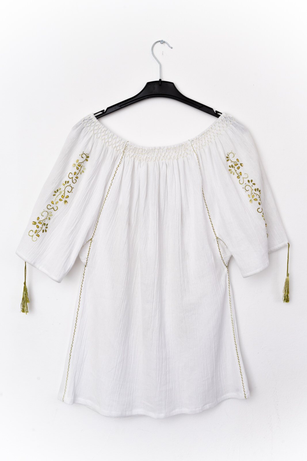 Ie stilizată cu mânecă scurtă pentru femei. Este brodată manual cu motive decorative cu fir de mătase verde și galben pe in topit alb.