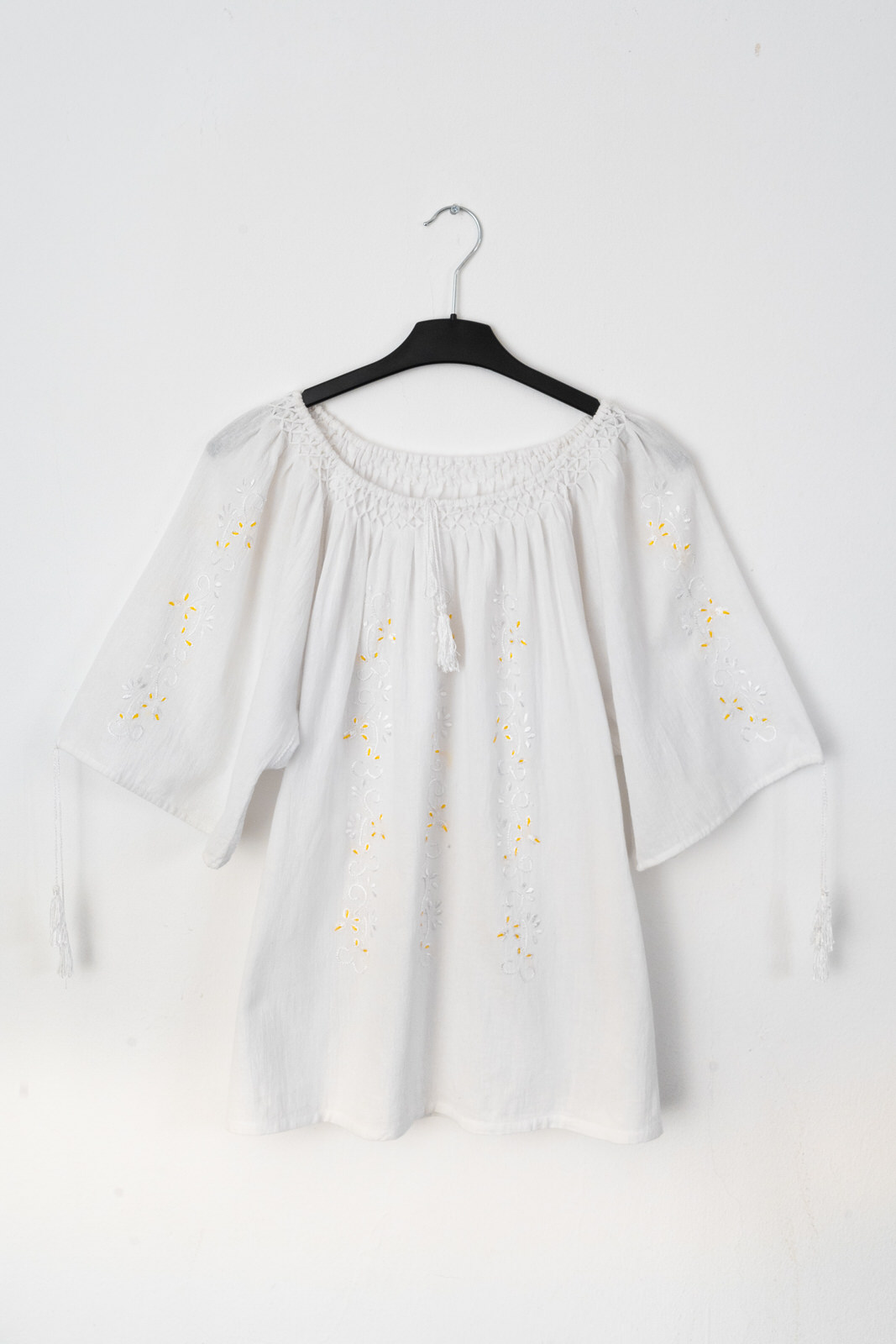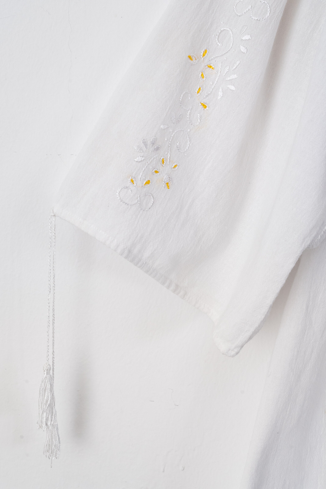 Ie stilizată cu mânecă scurtă pentru femei. Este brodată manual cu motive decorative cu fir de mătase alb și galben pe in topit alb.