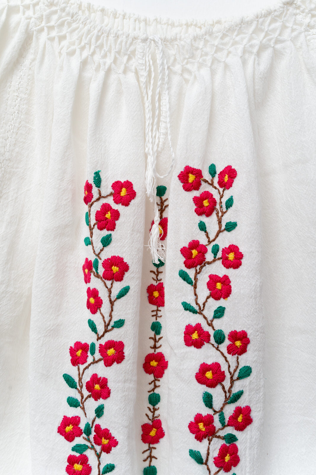 Este brodată manual cu motive florale pe in topit cu fir de bumbac roșu, verde și galben.
