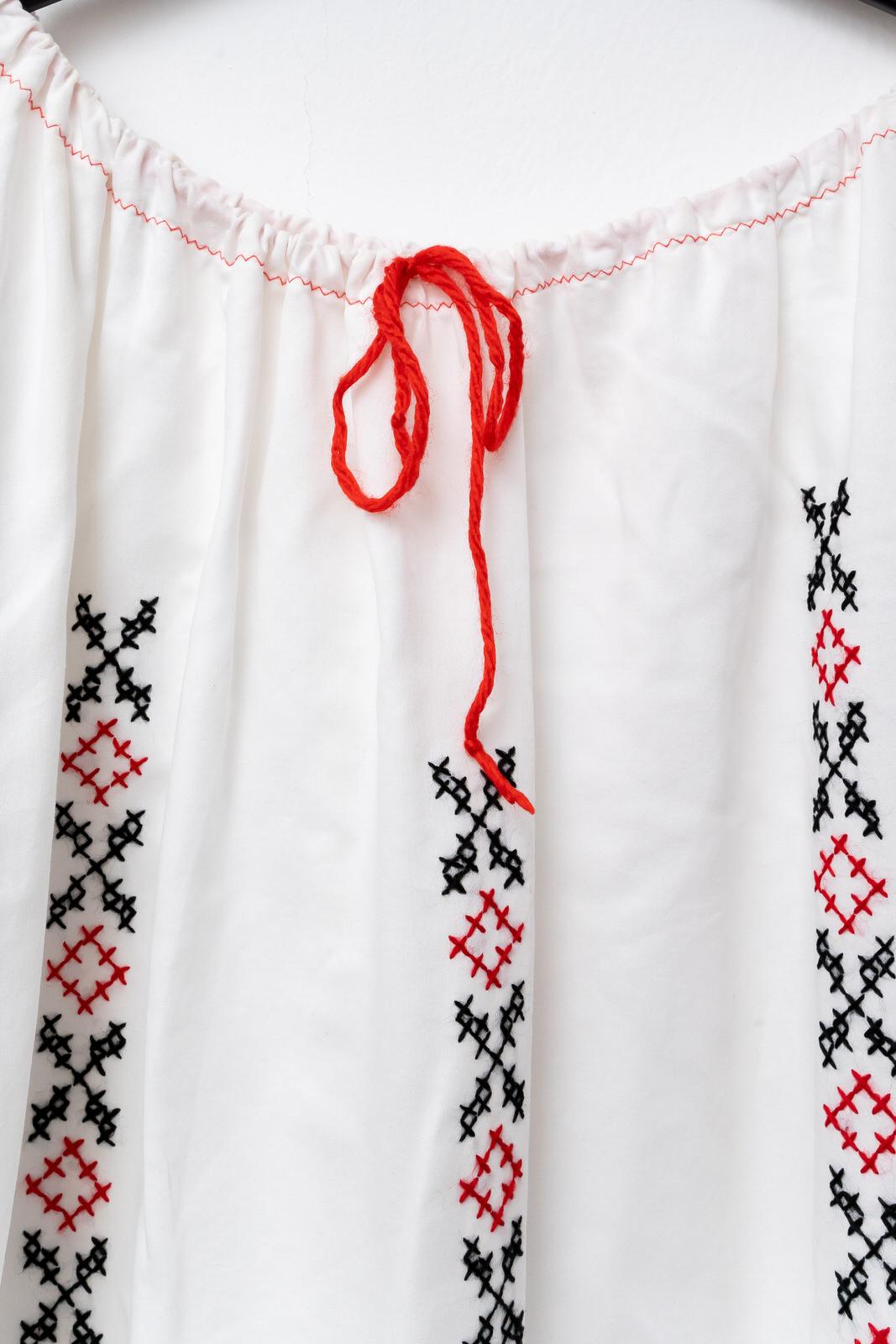 Este brodată manual cu motive geometrice pe pânză albă din bumbac cu fir roșu și negru.